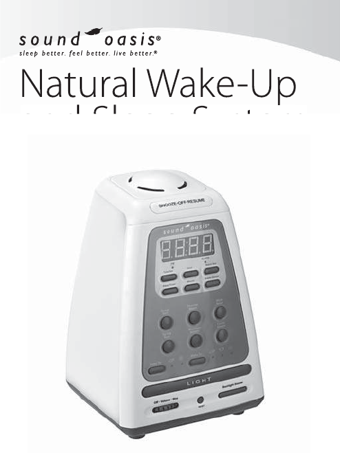 BLS-100SO Natural Wake-Up and Sleep System Use & Care Manual Please Read Prior to Use Sound Oasis® is the world leader in sound therapy systems. We are dedicated to making life healthier and more enjoyable with creative sound solutions that combine superior quality with the very latest technology. Your Natural Wake-Up and Sleep System allows you to wake-up more refreshed while helping you sleep and relax easier. For customer service, please call 1-866-625-3218 or visit us at www.soundoasis.