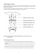 2.2 Mounting the Camera The dome camera is for use in surface or pendent mounting applications, and the mounting member must be capable of supporting loads of up to 10 lb (4.5 kg). (Pendent mounting must use pendent mount accessory.) The dome camera’s mounting bracket should be attached to a structural object, such as hard wood, wall stud or ceiling rafter that supports the weight of the dome camera. CAUTION: A silicone rubber sealant must be applied to seal the housing to secure waterproofing. 2.2.
