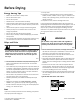 Before Drying Before Drying Energy Saving Tips • • • • • • • • • • Make sure the lint filter is always clean. Do not overload the dryer. Do not overdry items. Remove items to be ironed while still damp. Large loads of similar fabrics dry the most efficiently. However, dry permanent press in smaller loads to prevent wrinkling. Use the correct cycle for the type of fabric being dried. Locate your dryer so the exhaust duct is as short and straight as possible. Do not open the door during the drying cycle.