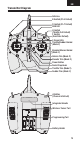 EN Transmitter Diagram Antenna B Switch (Ch 5 Default) D Switch (Ch 7 Default) RGB LED H Switch (Throttle Cut Default) F Switch (Dual Rate Default) 4 Green LEDs Throttle/Rudder Gimbal (Mode 2) Elevator/Aileron Gimbal (Mode 2) Aileron Trim (Mode 2) Elevator Trim (Mode 2) Power Button Neck Strap Hook Throttle Trim (Mode 2) Rudder Trim (Mode 2) A Button (Channel 6 Default) Integrated Handle Wireless Trainer Port Programming Port Battery Holder 5