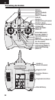 DE Darstellung des Senders Antenne Schalter B (Kanal 5 Standard) Schalter D (Kanal 7 Standard) RGB LED Schalter H (Gasabschaltung Standard) Schalter F (Duale Geschwindigkeit Standard) 4 Grüne LEDs Gimbal Gas/Ruder (Modus 2) Gimbal Höhenruder/ Querruder (Modus 2) Querrudertrimmung (Modus 2) Höhentrimmung (Modus 2) Ein-/Ausschalter Haken Umhängeriemen Gastrimmung (Modus 2) Seitenrudertrimmung (Modus 2) Schalter A (Kanal 6 Standard) Integrierter Griff Anschluss WirelessTrainer Programmieranschluss Akku-Halt