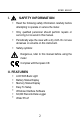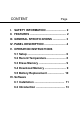CONTENT Page I. SAFETY INFORMATION --------------------- 2 II. FEATURES --------------------------------------- 2 III. GENERAL SPECIFICATIONS -------------- 3 IV. PANEL DESCRIPTION ----------------------- 4 V. OPERATION INSTRUCTIONS 5.1 Setup ----------------------------------------- 6 5.2 Record Temperature--------------------- 8 5.3 Erase Memory ----------------------------- 9 5.4 Download Memory ----------------------- 9 5.5 Battery Replacement ------------------ 10 VI. Software 6.
