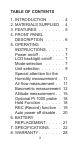 TABLE OF CONTENTS 1. INTRODUCTION . . . . . 4 2. M ATERIALS SUPPLIED . . 4 3. FEATURES . . . . . . . . 5 4. FRONT PANEL DESCRIPTION . . . . . . 6 5. OPERATING INSTRUCTIONS . . . . . . 7 Power on/off . . . . . . . . 7 LCD backlight on/off . . . . 7 Mode selection . . . . . . 7 Unit selection . . . . . . . 9 Special attention for the Humidity measurement . . 11 Air flow measurement . . . 11 Barometric measurement . 12 Altitude measurement . . .