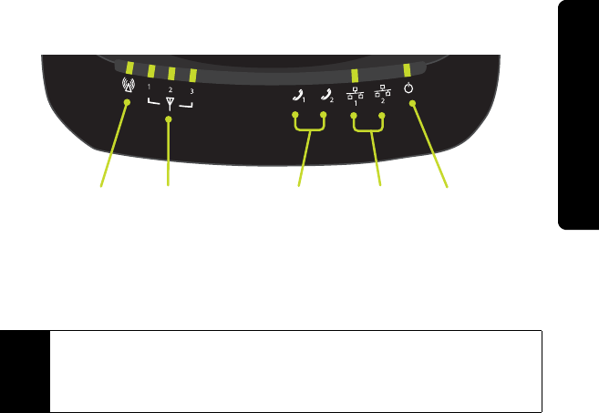 2. Phone 1 / Phone 2 LEDs: Illuminates when the VoIP phone “line” is in use. If no voice