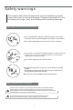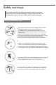 Safety warnings This chapter describes the important security matters to prevent users from injury or property damage. Please understand fully the following text (logo, icon) and comply with the safety warnings. Electricity related warnings Do not pull on the power cord when unplugging the wine cooler. Please rmly grasp the plug to unplug from the socket. Do not damage the power cord under any condition so as to ensure safety use. Do not use if the power cord is damaged or if the plug is worn.