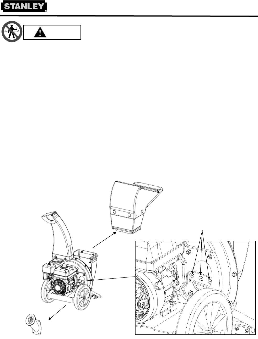 WARNING: All guards, chutes, and fasteners must be assembled in their proper locations before attempting to start the chipper
