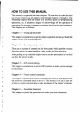 HOW TO USE THIS MANUAL This manual is organized into nine chapters. To learn how to make the best use of your printer you are urged to read through chapters 1 through 3. The remaining chapters may be treated as a reference guide for programming operations, etc. It assumes a degree of acknowledge off the operation of computers (for instance, it assumes you know about hexadecimal numbers).