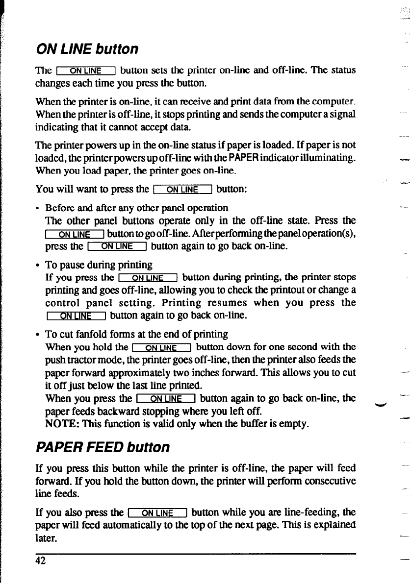 The 1 ON LINE 1 button sets the printer on-line and off-line. The status