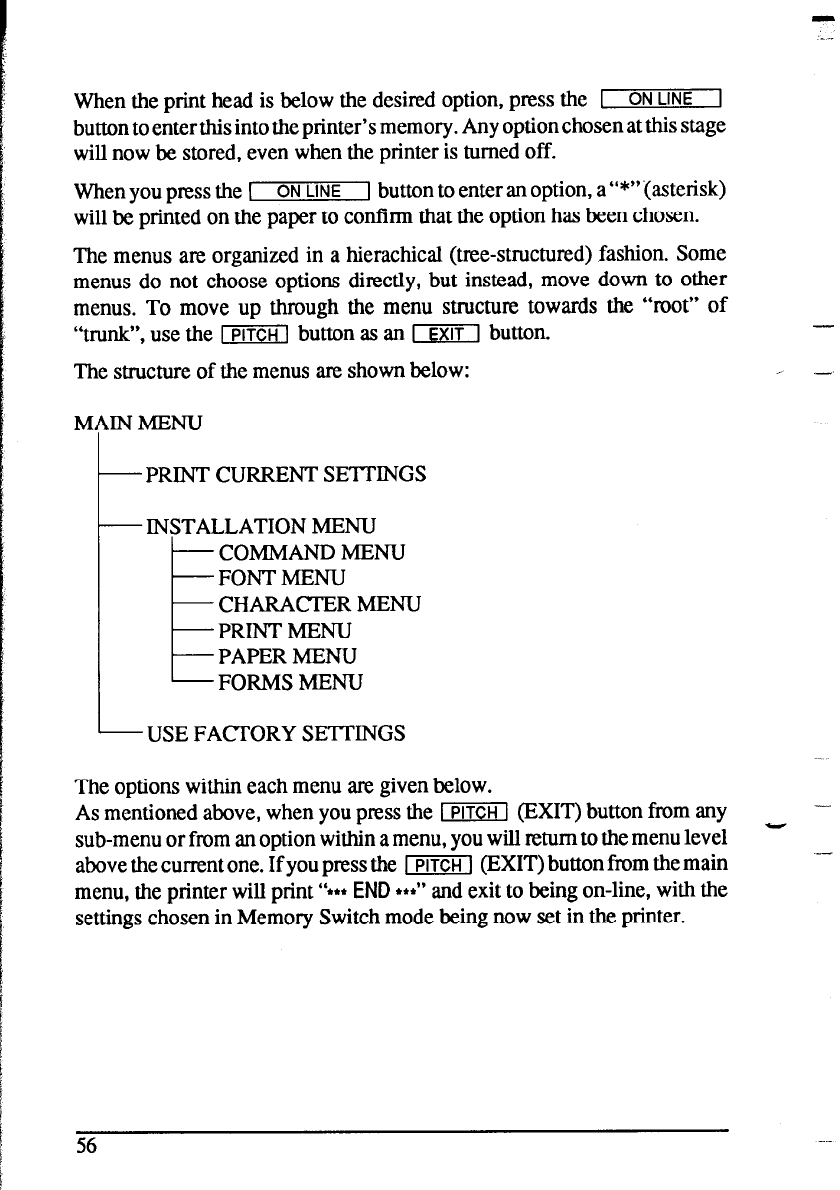 menu, the printer will print “a++ END l +*” and exit to being on-line, with the