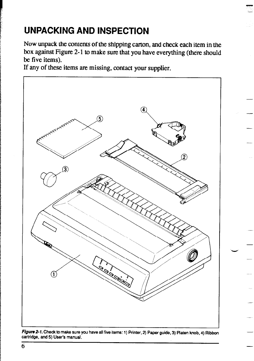 FrgutuZ-7. Chedc to make sure you have all five items: 1) Printer, 2) Paper guide, 3) Platen knob, 4) Ribbon