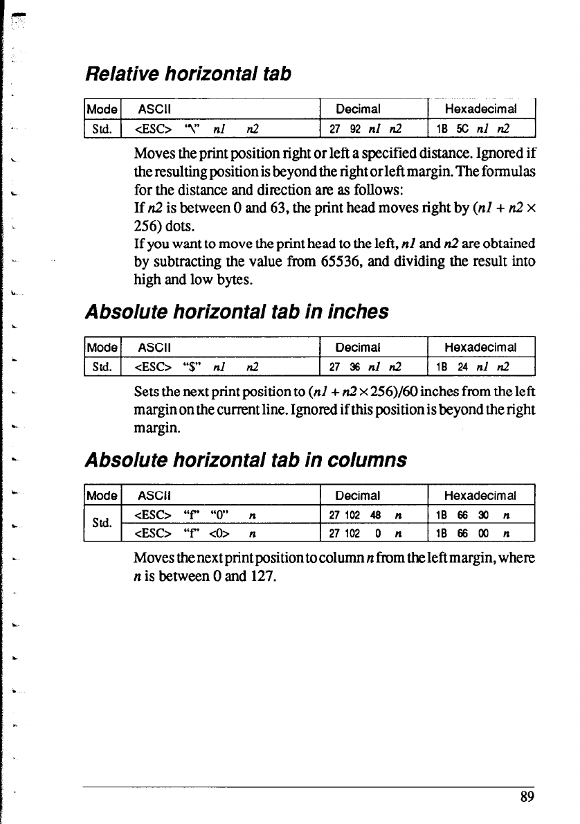 Sets the next print position to (nl + n2 x 256)/60 inches from the left