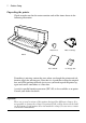 2 Printer Setup Unpacking the printer Check to make sure that the carton contains each of the items shown in the following illustration. Platen knob Ribbon cartridge Printer , User s manual 3.5" Floppy disk If anything is missing, contact the store where you bought the printer and ask them to supply the missing part. Note that it is a good idea to keep the original box and all the packing materials just in case you need to pack the printer up again and send it somewhere at a later date.