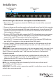 Installation Local Connectors (Console) PC Connectors (Host) *SV841HDIE Shown Connecting to the Host Computers and Network 1. Power down the computer to which the KVM Remote Control will be connected (Host computer). 2. If present, disconnect the existing monitor and keyboard/mouse from the Host computer. 3. Using a StarTech.com integrated KVM cable (sold separately), locate the male VGA (monitor) connector and connect it to the VGA-out connector on the back of the Host computer’s video card. 4.