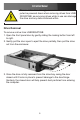 Instruction Manual 3. Ensuring the computer is powered down, remove the slot cover from a 3.5” floppy drive bay on the host computer. 4. Gently, slide HSB220SAT25B into the now vacant 3.5” floppy drive bay, threading the connected cables through the opening, until the front panel of HSB220SAT25B is flush with the computer case front panel. 5.