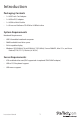 Introduction Packaging Contents • 1 x USB Crash Cart Adapter • 1 x USB to PS/2 adapter • 1 x USB A to Mini-B cable • 1 x Driver and Software CD-ROM or USB flash drive System Requirements Notebook Requirements • USB 2.0 enabled notebook computer • 20MB available hard drive space • 24-bit capable display • Windows XP(32/64bit)/ Vista(32/64bit)/ 7(32/64bit)/ Server 2008 R2, Mac OS x, and Linux Fedora(FC10/ FC11)/ Ubuntu (8.10/9.