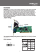 Installation WARNING! PCI cards, like all computer equipment, can be severely damaged by static electricity. Be sure that you are properly grounded before opening your computer case or touching your PCI card. StarTech.com recommends that you wear an anti-static strap when installing any computer component. If an anti-static strap is unavailable, discharge yourself of any static electricity build-up by touching a large grounded metal surface (such as the computer case) for several seconds.
