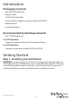Introduction Packaging Contents • NAS HDD RAID Enclosure • Ethernet Cable • 1M USB 3.0 A to B Cable • Universal Power Adapter w/ regional cables (NA/UK/EU) • Rubber foot set • Instruction Manual Recommended System Requirements • 2X 3.5” SATA hard drives For NAS Operation • Computer system or Network with available LAN port For DAS Operation • Computer system with available USB Port (3.0/2.0) Getting Started Step 1.