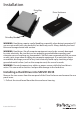 Installation Drive Bay Drive Enclosure Drive Bay Bracket WARNING: Hard drives require careful handling, especially when being transported. If you are not careful with your hard disk, lost data may result. Always handle your hard drive and storage device with caution. WARNING: Hard drives, like all computer equipment can also be severely damaged by static electricity. Be sure that you are properly grounded before opening your computer case or touching any components. StarTech.