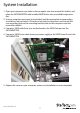 System Installation 1. Open your computer case (refer to the computer case user manual for details), and place the SAT32MSATPEX with installed MSATA drive into an available expansion slot. 2. Using a computer case screw (not included) and the appropriate corresponding screw driver (not included). Drive the screw into the computer case through the case mounting hole on the mounting bracket (refer to the computer case user manual for details). 3.