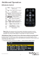Additional Operation IR Remote Control 1 Menu – Open on screen display (OSD) menu 2 Exit – Close OSD menu / Cancel connection 3 Source – Switch transmitters (If more than one is connected) 4 – Move Cursor 5 OK – Select OSD option 6 Delete – Delete a Transmitter 7 Add – Add a Transmitter 8 Guest – Power On/Off 9 Input Devices – Select to switch between added Transmitters Note: Before the remote control can operate, the battery protector must be removed from the battery compartment.