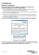 Installation Windows Installation Please ensure that the driver installation is complete prior to the physical installation (plugging in) of the USB 3.0 Video Adapter 1. Download the latest drivers from the StarTech.com website (recommended), or insert the included Driver CD into your CD/DVD-ROM drive. 2. Locate the Setup.exe application. This file will be located in the root directory of the Driver CD (e.g. D:\) or downloaded file. 3. Executing the Setup.exe application will launch the following screen.