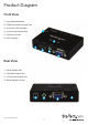 Product Diagram Front View 1. Input Selection Button 2. HDMI Audio/Video Input#1 Port 3. Active Port LED Indicators 4. 3.5mm Audio Input#2 Port 6 5. VGA Input #2 Port 6. EDID Selection Rear View 1. Power Adapter Port 2. VGA Video Output Port 3. 3.5mm Audio Output Port 4.