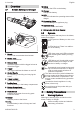 Overview 3 English Overview 3.1 12 Button Activates the LEDs on the battery. Blower, Battery and Charger 3 14 LED The LED indicates the operating status of the charger. 6 1 2 13 Charger Charges the battery. 7 4 15 Connecting Cable Connects charger to appliance plug. # 16 Appliance Plug Connects cable to wall outlet. 9 # Rating Label with Serial Number 3.2 13 10 Meanings of symbols that may be on the blower, battery and charger: 1 LED glows red. Battery too hot or too cold.