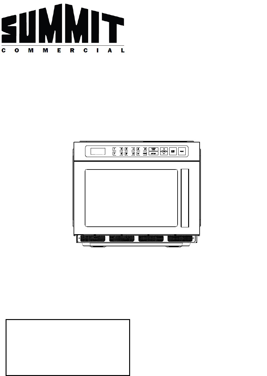 DUAL MAGNETRON COMMERCIAL MICROWAVE OVEN Model: SCM1800M2 User's manual Please read these instructions carefully before installing and operating the oven. In the space below, record the SERIAL NO. found on the nameplate of your oven and retain this information for future reference. FELIX STORCH, INC. Summit Appliance Division 770 Garrison Avenue SERIAL NO. ________________________ Bronx, New York 10474 Please save sales receipt for warranty. www.summitappliance.