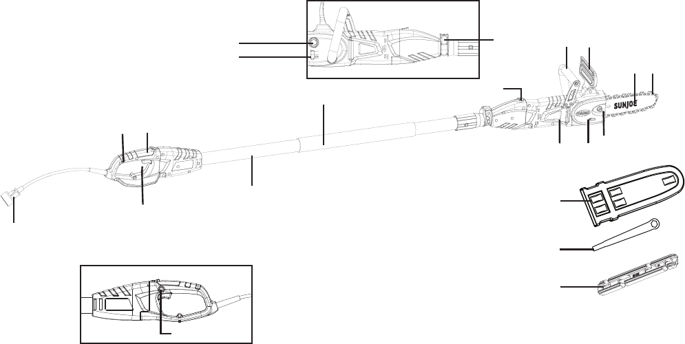 below to the 2-in-1 pole + chain saw in order to familiarize yourself with the location of the various controls and adjustments.