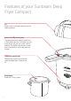 Features of your Sunbeam Deep Fryer Compact Lid Allows steam to escape safely during the cooking process. �� �� � ����������������� Basket with 500g food capacity The removable mesh cooking basket has a 500g food capacity. The basket has two frying levels and you can shake it whilst cooking. The basket also features a cool touch handle which folds away for easy storage. Temperature control light Temperature control light indicates when the deep fryer is heating the oil.
