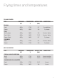 Frying times and temperatures FISH AND SEAFOOD TYPE MAXIMUM QTY TEMPERATURE °C APPROX. TIME (MIN) SUGGESTIONS Fresh 600g 170C 5-7 Crumb/batter Frozen 600g 190C 3-5 Fry frozen Small pieces 400g 180C 3-5 Crumb / batter Fresh fillets 600g 160C 7-10 Crumb / batter Frozen fillets 600g 160C 5-7 Fry frozen Fresh 500g 170C 5-7 Crumb / batter Frozen 500g 170C 3-5 Fry frozen MAXIMUM QTY TEMPERATURE °C APPROX.