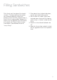 Filling Sandwiches Thick Snack seals the edges of the toasted sandwich. The deep cooking plates enable you to prepare appetising snacks with generous amounts of filling. Approximately ¹/³ cup of filling is recommended, however, this amount may vary depending on the thickness of the bread used. Regular white or brown sliced bread is recommended for soft or “runny fillings”. 1. Place bread slices, buttered sides down, onto the pre-heated cooking plate. 2.