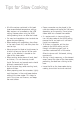 Tips for Slow Cooking • All of the recipes contained in this book have recommended temperature settings. Most recipes can be cooked on the LOW setting, however when using the HIGH setting cooking times can often be halved. • Cut meat and vegetables into standard size pieces for even cooking. • When cooking with vegetables, place them in the crock insert first, and then place the meat on top.