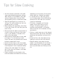 Tips for Slow Cooking • All of the recipes contained in this book have recommended temperature settings. Most recipes can be cooked on the LOW setting, however when using the HIGH setting cooking times can often be halved. • Food will be brought to a simmer on all settings. The setting determines the time needed to reach a simmer. • When cooking with vegetables, place them in the crock insert first, and then place the meat on top.