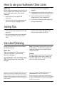 How to use your Sunbeam Citrus Juicer. Before use Before using your Sunbeam citrus juicer for the first time, apart from the motor base, wash all parts in warm soapy water. Rinse and dry thoroughly. 1. Place the citrus juicer jug onto the motor base. 2. Select the cone size desired, depending on the size of fruit you are going to juice. 3. Cut citrus fruit in half, cutting across segments. 4. Plug the power cord of the citrus juicer into a 230-240V power outlet and turn power on. 5.