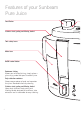 Features of your Sunbeam Pure Juice Food Pusher Stainless steel grating and filtering basket Twin safety levers Motor base On/Off control button Coninuous Juicing Allows you unlimited juicing, simply place a glass or jug under the spout to collect juice. Pulp collection container Stores coarser pieces of pulp and separates the juice. Removable for easy cleaning.