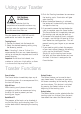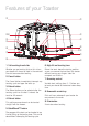 Features of your Toaster 1 1 56 2 3 3 2 4 56 7 4 7 8 1. Self-centring bread slots 6. High-lift and toasting lever Whether you are toasting thick or thin slices, your bread will always be held in the centre of the slot to ensure even toasting. Raises the toast above the starting position so you can remove the toast from the toaster without burning your fingers. Ideal for crumpets and muffins. 2. Cancel button The Cancel button immediately interrupts any toasting cycle and pops the toast up. 3.