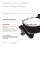 Features of your Sunbeam Classic Skillet Integrated Knob & Adjustable Steam Vent Integrated knob and adjustable steam vent allows you to accurately control moisture levels during cooking. Cool Touch Handle For safe cooking and carrying of your skillet. Control Probe Inlet Cast-in Element The element is completely cast into the heavy duty base providing superior heat distribution. High Grade Non-Stick Cooking Surface Enables fat-free cooking and easy wipe down cleaning.