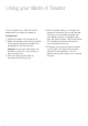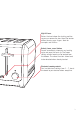 Using your Metro 4 Toaster Plug the toaster into a 230-240 volt AC power outlet and switch the power on. Toasting Bread 1. Position the bread into the bread slot. 2. Select the desired colour setting on either of the electronic browning controls that corresponds to the toasting slots. Important: Do not toast stale bread, rice crackers or similar on a high setting as they may catch fire. 3. Push the Toasting Lever down to commence the toasting cycle. 4 4.