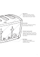 High lift lever Allows you to remove crumpets, muffins and small pieces of toast safely without burning your fingers. Cancel button Immediately interrupts any toasting cycle and pops the toast up. 1 2 T CRUMPE CRUMPET Electronic browning control Variable toast settings from 1-6 with additional frozen setting; allows you to toast your bread to the desired colour, consistently. CANCEL CANCEL PUSH Cord storage The cord can be wrapped underneath the unit for safe and convenient storage.
