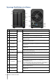 Appendix B LED Indicator Table AppendixB: LED Indicator Color Status Description Static Drive ready and idle Blinking Accessing drive Static Drive error Green Disk (1~2) Orange Off Green STATUS HDD hibernation, or no internal drive Static Volume normal Static Available volume space < 1GB or < 1 % Disk crashed/Volume degraded or crashed Orange Blinking No internal drive Off HDD hibernation Static Network connected Blinking Network active Green Front LAN Off No network Static Devic