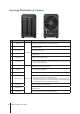 Synology DiskStation at a Glance 4 No. Article Name Location Description 1 Drive Tray 2 Drive Status Indicator 3 Drive Tray Lock 4 Status Indicator 5 LAN Indicator Displays the status of the network connection. For more information, see "Appendix B: LED Indicator Table". 6 Power Button 1. Press to power on the DiskStation. 2. To power off the DiskStation, press and hold until you hear a beep sound and the Power LED starts blinking.