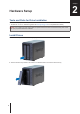 Chapter Hardware Setup Tools and Parts for Drive Installation • A screwdriver (only for 2.5" drives) • At least one 3.5” or 2.5” SATA drive (please visit www.synology.com for compatible drive models) Warning: If you install a drive that contains data, the system will format the drive and erase all existing data. Please back up any important data before installation. Install Drives 1 Press the lower part of the hard drive tray to pop out the handle.