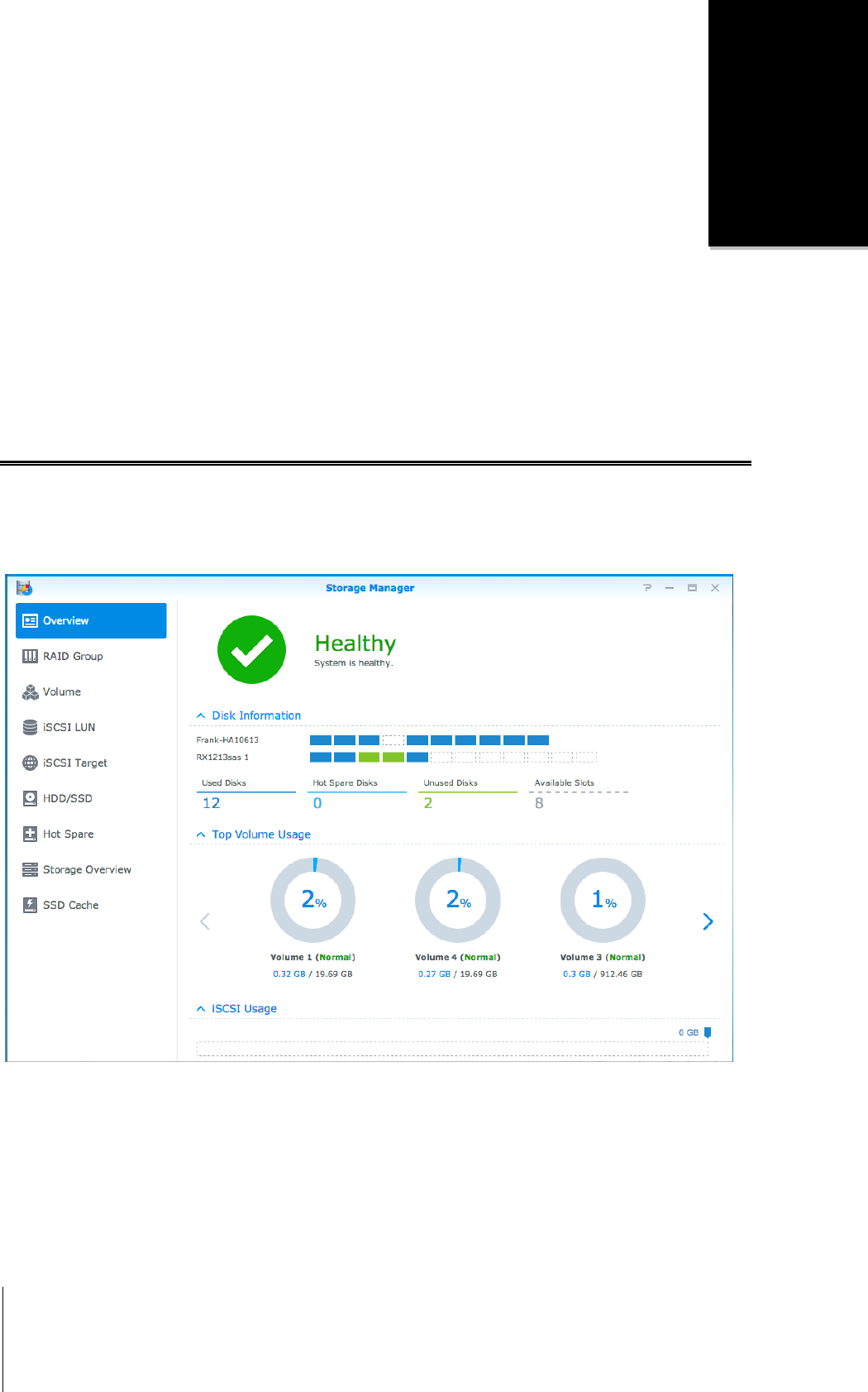 und Speicherbereiche verwalten. In diesem Kapitel wird beschrieben, wie RAID-Gruppen, Volumes und iSCSI