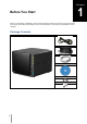 Chapter Chapter 1: 1 Before You Start Before you start setting up DiskStation, please check the package contents to verify that you have received the items below. Please also read the safety instructions carefully before use to prevent your DiskStation from any damages. Package Contents Main Unit x 1 AC power cord x 1 AC power adapter x 1 2M RJ-45 LAN cable x 2 Installation disc x 1 Screws for 3.5” hard drives x 18 Screws for 2.