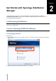 Chapter Chapter 2: Get Started with Synology DiskStation Manager This chapter explains how to log in to Synology DiskStation's web-based management UI, Synology DiskStation Manager (DSM), customize your own desktop, manage its taskbar, and use the Main Menu to access DSM settings and applications. Install Synology DiskStation For more information setting up Synology DiskStation and installing DSM, see the Quick Installation Guide that came with your installation disc.
