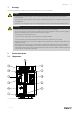 2 | Product description Position Description 1. Compressor 2. Condenser coil 3. Evaporator coil 4. Filter drier with sight glas 5. Electronic expansion valve 6. Drip-tray with drain 7. Water seal 8. Cable grommet for external cabling 9. El. cabinet 10. Frequency converter 11. Pressure/hot gas switches 12. Measuring points refrigerant system high/low 2.2 Electrical cabinet 8 6 7 1 2 3 4 5 Fig. 2 Electrical cabinet Position Description 1. Terminal block, mains supply 2.