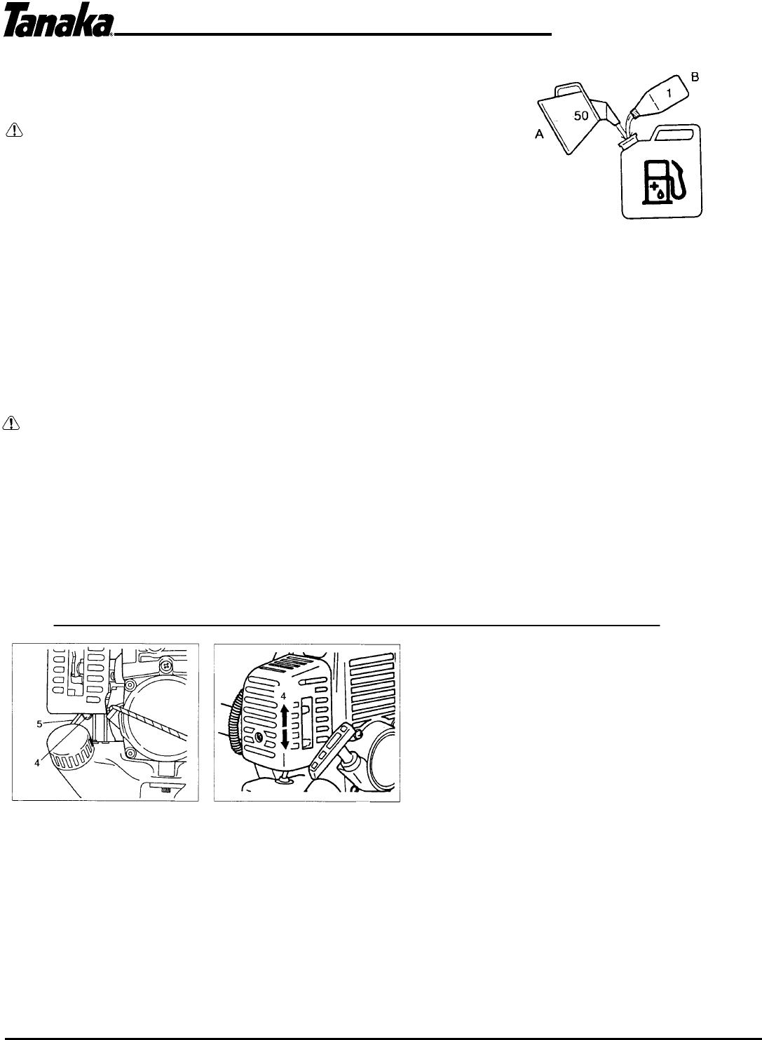 • Use Tanaka two-cycle oil or a quality two-cycle oil at mixing ratio of 50:1 (Gasoline (A) : Oil (B)).