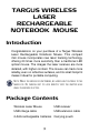 TARGUS WIRELESS LASER RECHARGEABLE NOTEBOOK MOUSE Introduction Congratulations on your purchase of a Targus Wireless Laser Rechargeable Notebook Mouse. This compact mini mouse incorporates new laser tracking technology, offering 20 times more sensitivity than a traditional LED optical mouse. The images the laser receives are more detailed, with higher contrast. The mouse can track more reliably, even on reflective surfaces, and its small footprint makes it ideal for portable computing.