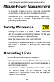 Targus Wireless Laser Rechargeable Notebook Mouse Mouse Power Management • To power the mouse on and off, slide the on/off switch at the bottom of the mouse to the desired position. • When power is on, the mouse goes into "sleep mode" after 8 minutes of non-use. To activate the mouse, press any mouse button. Safety Measures • Although this mouse is a Class 1 Laser Product and safe for operation, avoid pointing the laser into the eyes or looking directly into the laser emitter.